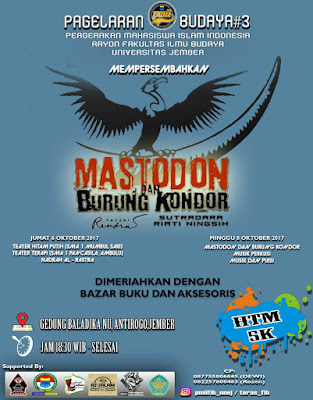 Kali ini akan dipentasan Teater Rayon Sastra (TERAS) Pergerakan Mahasiswa Islam Indonesia (PMII) Rayon Fakultas Ilmu Budaya Universitas Jember, Jawa Timur, pada Minggu, 8 Oktober 2017, di Gedung Baladika NU Jember pukul 18.30 WIB.