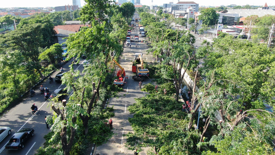 Surabaya – Berbagai langkah dilakukan Pemkot Surabaya untuk mengurangi dampak bencana di musim hujan. Salah satunya dengan memotong atau memendekkan batang dan ranting pohon besar yang beresiko tumbang atau patah terutama jika terjadi angin kencang dan hujan deras.