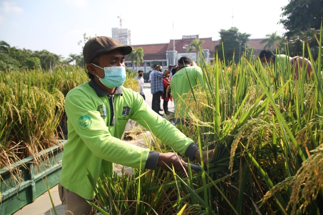 idealoka.com (Surabaya) – Sesuai program kedaulatan pangan dalam menghadapi pandemi Covid-19, Wali Kota Surabaya Eri Cahyadi bersama jajarannya panen padi di Taman Surya Balai Kota Surabaya, Rabu, 9 Juni 2021.