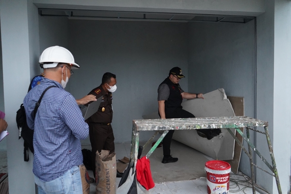 Kemudian, pengecekan dilakukan pula pada material atap los pasar yang belum terpasang termasuk pengukuran ketebalan cor pada lantai. Setelah diukur, ketebalan cor tidak sama, ada yang memiliki ketebalan 6,7, dan 8 cm.