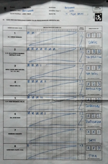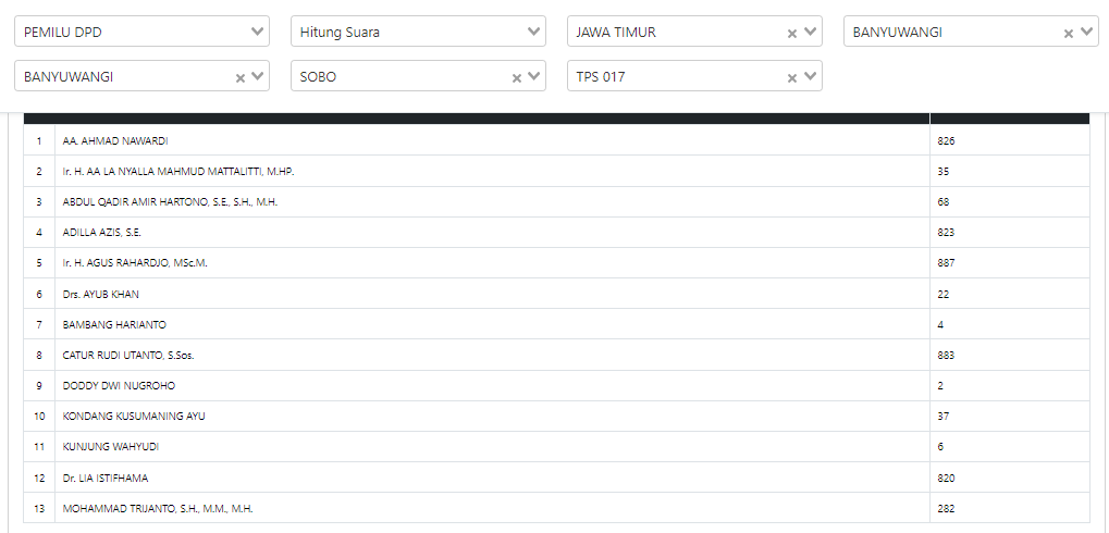 Salah satunya rekap perolehan suara DPD Jawa Timur dari TPS 017 Kelurahan Sobo, Kecamatan/Kabupaten Banyuwangi.